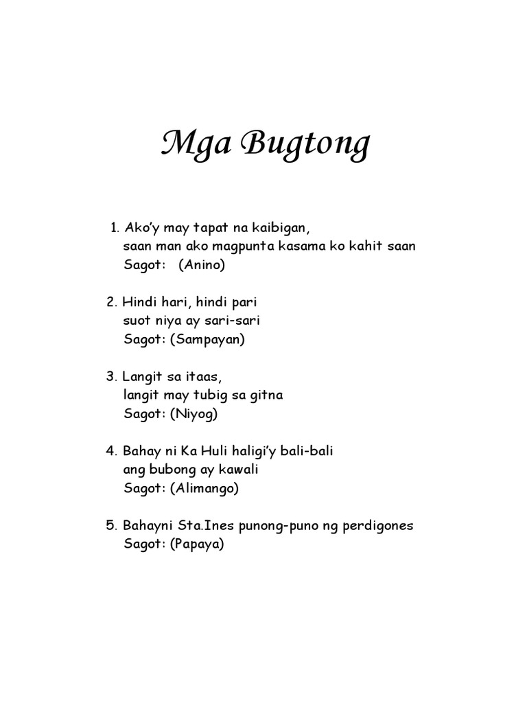 Bugtong bugging Pag sa umaga apat ang paa Pag sa tanghali dalawa ang paa Pag sa gabi naging tatlo na. It is also a huge part of most of our childhood as these opened up our minds to complex and more critical thought analysis. Ang apat kong irog saanman parooy kasunod-sunod Mapatubig ay di nalulunod mapaapoy ay di nasusunog Sa araw ay nahihimbing sa gabi ay gising Bungbong kung maliwanag kung gabi ay dagat Hanggang leeg kung mababaw kung malalim hanggang baywang Isang balong malalim punong-puno ng patalim Itinanim sa kinagabihan sa kinaumagahan ay inani.